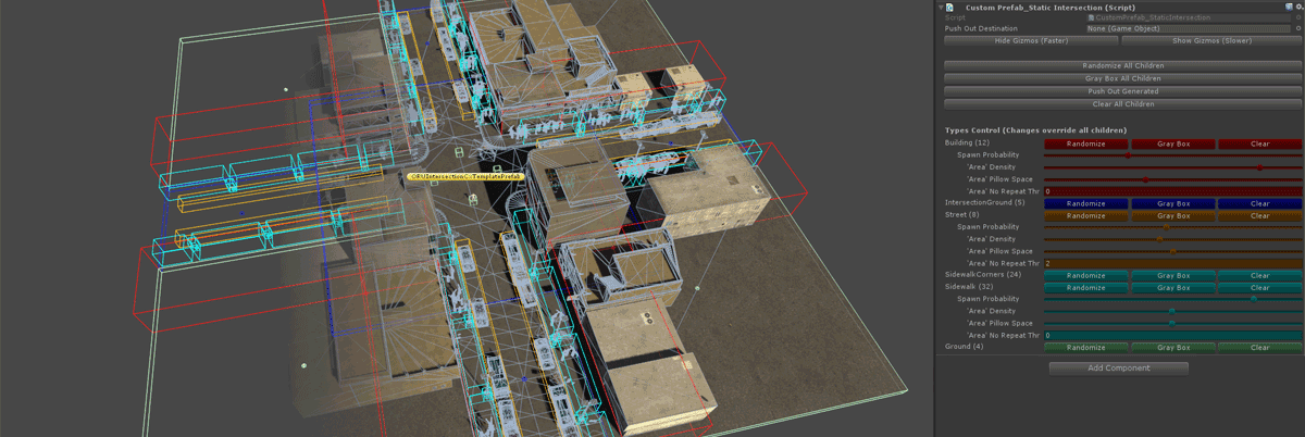 The city-tile templates becomes a very fast visualization and environment layout tool that lets designers iterate on mechanics while having maximum control, all without the cost of a heavy scene with lighting and dense geometry. These templates have high-level and precise parameterized control over asset density and style to help orchestrate a living, breathing experience.