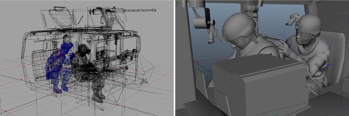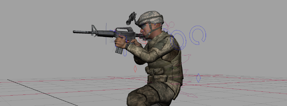 Characters and items mounting systems and tools have to be set up properly for seamless iteration and integration efforts throughout production. Vehicle mounting and animations are kept generic for flexibility in character role assignment. Items and weapons can be held in different ways. On the Maya side this means locking one or both hands on the weapon, with the ease to change the holding position on the weapon.