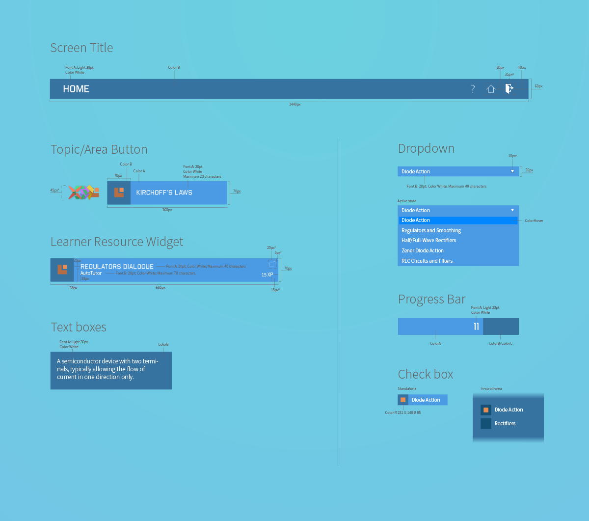 The application is to be a full-featured framework, but is flexible for lesson content and class size. To begin, we surveyed current-gen games as well as similar tools to understand the visual language early-20-year-olds are used to. Then we created a visual style, which helped flesh out features for the system.