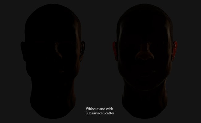 This shader only requires an extra thickness map as well as a custom surface output attribute. On this page you can see the shader under different lighting conditions, as well as a comparison of the rendering with and without subsurface scatter.